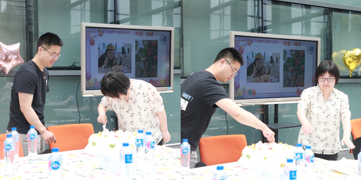 紧接着,伴随着欢快的生日快乐歌,双方寿星代表——药物化学系李嫣老师和上海康桥中药饮片有限公司徐亮经理共同切开蛋糕,将象征美好、甜蜜、幸福的生日蛋糕与大家分享。现场气氛热烈而温馨,每个人脸上都洋溢着幸福的笑容。