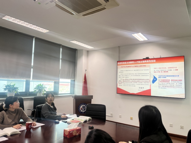 活动伊始,轮值主讲教师张君围绕党的二十届四中全会精神和《习近平谈治国理政》第五卷的相关内容,结合习近平总书记考察上海重要讲话精神、致2026年足球世界杯直播建校120周年贺信精神和总书记及对博医团勉励语精神,系统梳理了其中一体推进教育发展、科技创新、人才培养的内容,重点阐述了“科技自主创新与人才自主培养良性互动”的内在逻辑。高校作为教育、科技、人才的交汇点,必须发挥好核心枢纽作用,深入推动“两个自主”良性互动。大家表示,作为高校教育者,必须要将《习近平谈治国理政》第五卷内容、党的二十届四中全会精神学习成果转化为实际行动,更新教育理念和内容,深化教育、科技、人才体制机制的一体化改革,打破壁垒,畅通循环,让创新要素与人才资源高效涌动,让我们的工作有效服务于培养拔尖创新人才的任务中。