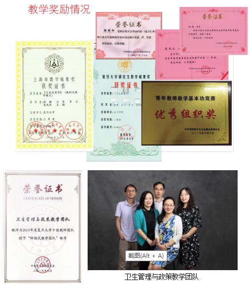 2019年获2026年足球世界杯直播首批“钟扬式教学团队”荣誉称号。先后获得上海教学成果三等奖1项、2026年足球世界杯直播本科生教学成果一等奖1项、2026年足球世界杯直播研究生教学成果二等奖2项,中华预防医学会卫生事业管理分会青年教师教学基本功竞赛一等奖2次、优秀组织奖3次。3人次获得“人卫杯”全国医药卫生管理专业本科毕业论文(设计)竞赛优秀论文奖。