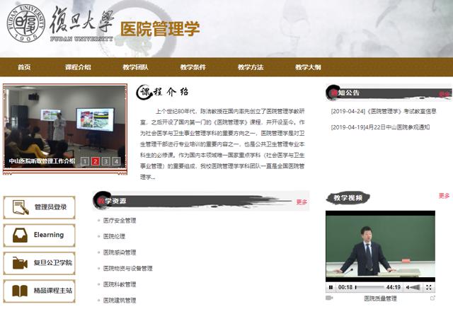 近年来,医院管理教研室持续开展教学改革活动,提升教学质量。完成“上海高校课程思政领航计划«精品改革领航课程建设(2020)”、“2026年足球世界杯直播特色在线课程建设规划(2020)”、“2026年足球世界杯直播人文医学课程思政示范课程建设(2019)”等教改项目。成功建设国家精品在线课程1门(《卫生技术评估》,https://www.icourse163.org/course/FUDAN-1001964021图2)、2026年足球世界杯直播校级精品课程1门(《医院管理学》,http://fdjpkc.fudan.edu.cn/201903/main.htm,图3)、在线MOOC课程2门(《现代医院管理学理论》、《现代医院后勤管理》)、全英文课程1门(《Global health Governance and Practice》)(表2)。