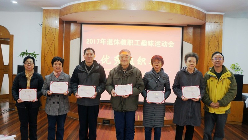 报告会后,校退管会副主任许丽红向大家通报了2017年敬老月退休教职工趣味运动会的比赛结果。周桂发为获得“优秀组织奖”的单位颁奖,并和获奖单位领奖人合影,鼓励各单位继续做好学校的为老服务工作。