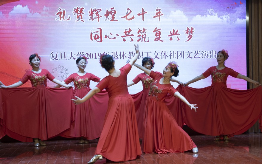 演出在合唱团嘹亮的歌声中拉开序幕,我校合唱一团的《中国梦想》、《茫茫云天》,外文小组的《莫斯科郊外的晚上》、《当我们年轻时》,枫林合唱二团的《我用歌声拥抱祖国》、《我和我的祖国》,邯郸二团的《绒花》、《长江之歌》等一首首饱含深情的曲目,讴歌新中国70年来取得的辉煌成就,深切表达了老同志们对祖国最衷心的祝福。合唱结束后,枫林沪剧小组为大家献上了二胡委婉柔和,曲调优美动听的沪剧选段《我生于百年繁华上海城》。邯郸健身操队更是带来了音乐强悍有震撼力,韵律动感节奏性强的《快乐的我们》,将现场气氛烘托到了顶点。合唱一团的小组唱《祖国 慈祥的母亲》,更是通过歌声将老同志们对祖国的爱表现的淋漓尽致。枫林舞蹈队的藏族舞《翻身农奴把歌唱》和邯郸校区舞蹈队的现代舞《雪绒花》通过优美的舞姿为观众们呈现了两段不同时期人们对于翻身做主人后的欢乐和对现在美好幸福生活的赞美,获得了现场观众的啧啧称赞。枫林合唱二团还带来了葫芦丝表演《映山红》,这也是他们第一次为大家呈现葫芦丝乐器的演奏。对于声乐,一团不仅带来了大合唱、小组唱,他们还带来了一首女声独唱。合唱一团李晓玲的意大利歌曲《主人,你听我说》,如同天籁之音,沁人心脾。最后一个压轴的节目是时装队的《快乐晚霞》,在富有节奏的韵律节拍下,时装队成员一个个走上舞台,男士身着时尚衬衫、白色休闲裤,从容、自信;女士身穿淡绿长裙,白纱披风,手持折伞、竹扇,端庄、高雅,通过时装走秀既是对昨日流金岁月的深情追忆,更是对现在幸福晚年生活的赞美,向大家展现我校退休教职工积极饱满的精神风貌。