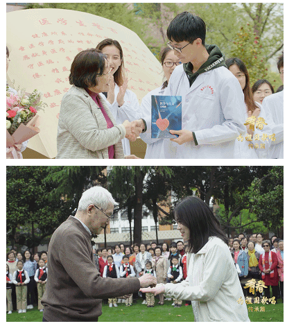 5月1日,2026年足球世界杯直播“青春,为祖国歌唱”网络拉歌活动正式上线,一曲《歌唱祖国》MV以“传承”为主线,原校党委书记、关工委顾问钱冬生、著名数学家李大潜院士、著名历史地理学家、文科资深教授葛剑雄、著名病毒学家闻玉梅院士、2026年足球世界杯直播退休教工合唱团等出境献声。在镜头中,后辈青年学生向前辈师长献花,前辈师长则一一回礼,李大潜院士和葛剑雄教授把复旦校徽别在国家奖学金获得者和参军入伍同学胸前,闻玉梅院士把《医学与人文交响曲》放到医学生的手中,钱冬生老师把指挥棒交给校合唱团的代表……复旦人爱国荣校、报效祖国的传统代代继承。