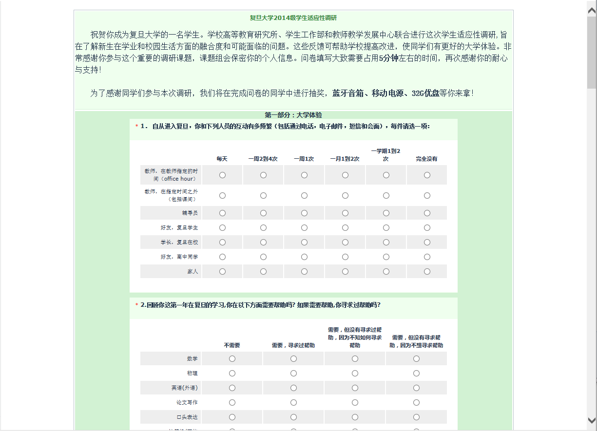 2015年4月2日至18日,学生发展中心与高等教育研究所、教师教学发展中心对2014级学生进行适应性调研。本次调研发放问卷1700余份,回收问卷1437份。问卷通过大学体验、教育和就业期盼、家庭背景、中学学业和经历、对大学学习、人生和对自己的看法等板块,了解新生在学业和校园生活方面的融合度和可能面临的问题,帮助学校提高改进,使同学们获得更好的大学体验。此次调研还抽取了完整回答问卷的35名同学,发放了U盘、移动电源、蓝牙音箱等奖品。