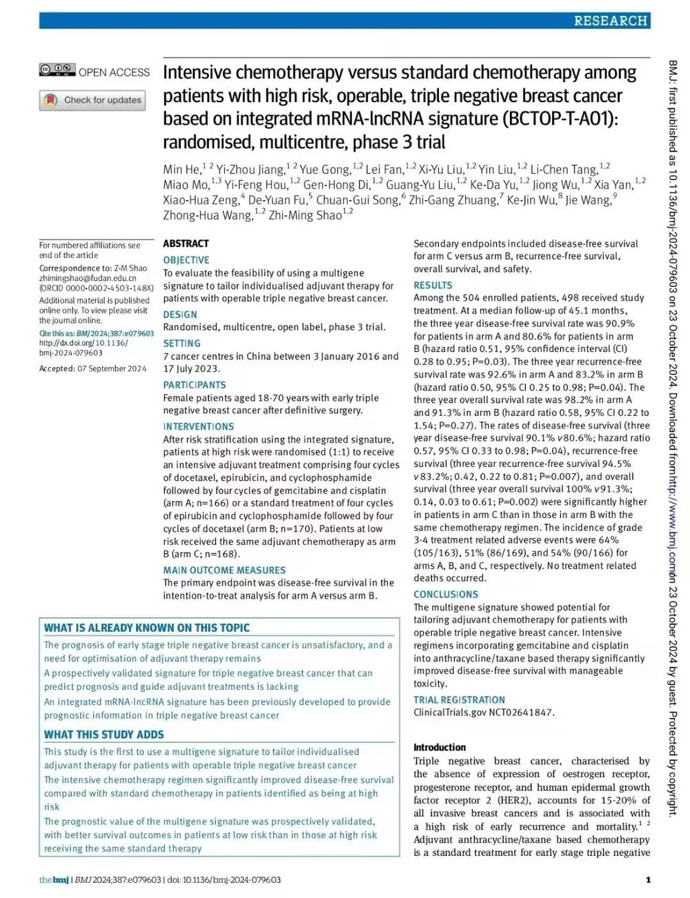 “多年来的研究成果使三阴性乳腺癌患者的辅助治疗更加精准和更有效,此次‘BCTOP-T-A01’研究的可喜成就,体现了系列研究从基础到临床的有效转化与衔接,为提升早期三阴性乳腺癌的治疗疗效、推动乳腺癌精准治疗做出了重要贡献。”邵志敏教授说,“该‘多基因模型’依托复旦肿瘤精准肿瘤中心开展临床检测,相关技术成果目前已经具备落地以及广泛推广的可行性,有望在更大范围内提升患者的治疗疗效。”